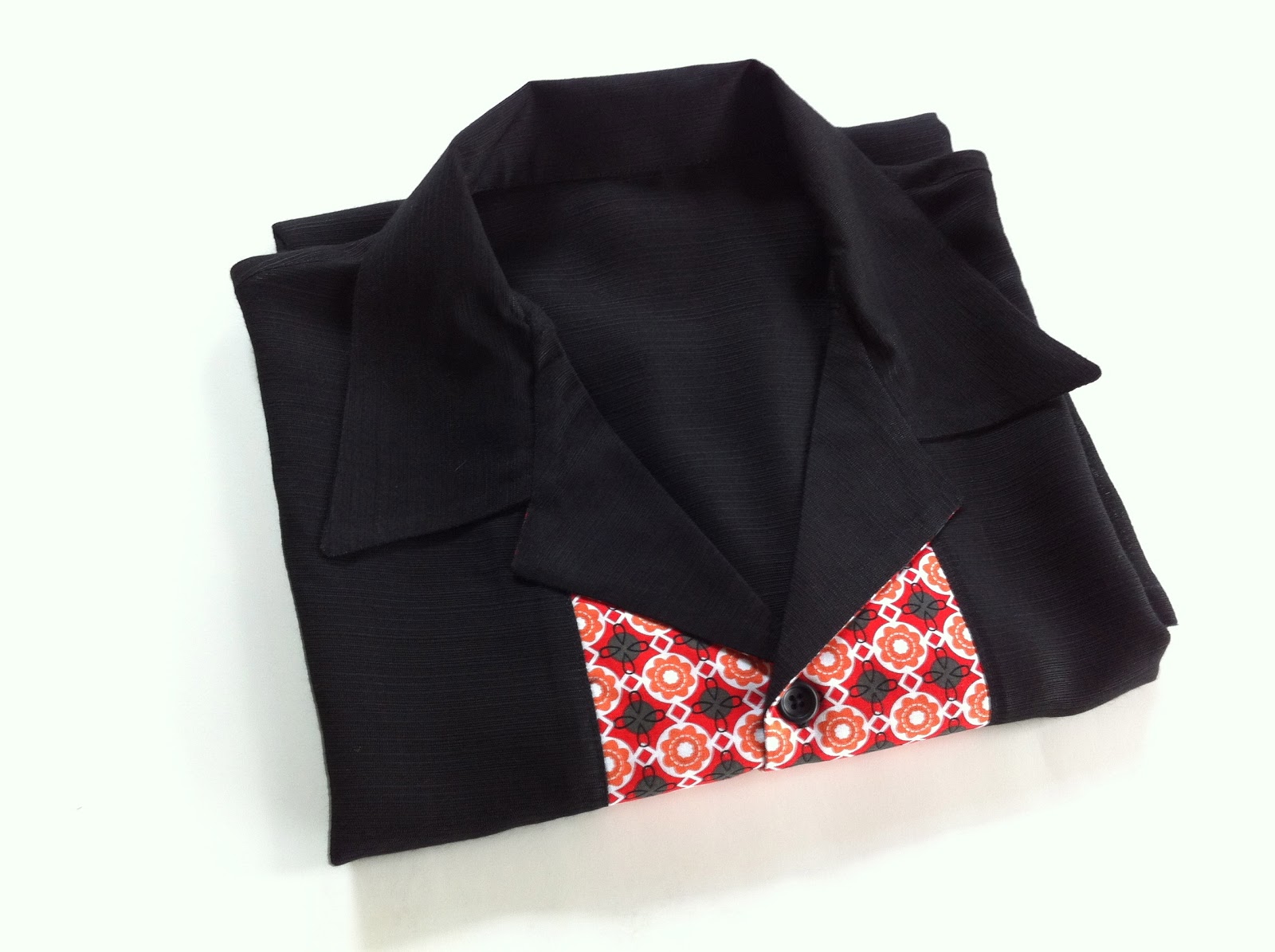 The bowling-shirt design is a modification of the pattern I used for Bill's Hawaiian shirt. I attempted this modification on a more traditional men's shirt pattern a few years ago, but I could see right away that I needed to use a spread-collar shirt as the base. I paid particular attention to matching the patterned fabric -- didn't I do a nice job?